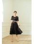 This black midi dress blends everyday ease with romantic charm. The simple round neckline and flutter sleeves keep the upper body light and elegant, while the tiered skirt creates a graceful swish as you walk. The standout detail is the soft pink belt with a flower accent, which cinches the waist and adds a delicate pop of color. Pair it with heels for a polished, ladylike look or with flats and a cardigan for a relaxed day outfit.