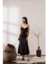 This black satin midi dress embodies minimalist sophistication. The fluid cowl neckline softens the décolletage, while slim straps and a clean back keep the design modern and understated. The dress drapes gently over the waist and hips, then widens subtly at the hem to create a graceful, elongated line. Paired with simple heels and a clutch, it becomes an effortlessly chic go-to for nights out, cocktail parties, or any occasion where you want a quietly luxurious, timeless look.