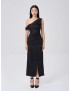 This black midi dress combines modern minimalism with elegant draping. The one-shoulder neckline creates a striking upper silhouette, while gathered ruching along the front shapes the waist and adds refined texture. The skirt falls in a clean line to mid-calf, with a front slit that elongates the legs and keeps every step effortless. Pair it with heels and statement earrings for a polished, confidence-boosting look that works for both formal and semi-formal occasions.