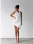 This white mini dress is bold and minimal at the same time. The one-shoulder cut keeps the upper body clean and striking, while the attached scarf detail wraps around the neck and trails elegantly for runway-inspired movement. The body-hugging fit and angled hem create a long, lean line that flatters the figure and puts the focus on the legs. Pair it with statement earrings and heels for cocktail parties, bachelorette events, or any occasion where you want a crisp, modern, and unforgettable look.