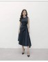 This navy satin midi dress combines simplicity with fluid drama. The front is kept minimal with a high round neckline and streamlined bodice, while the side is artfully ruched and gathered, releasing into a flowing draped panel that sways with every step. The asymmetrical hemline adds visual interest and elongates the figure, making it perfect for cocktail parties, weddings, dinners, or special events where you want to look polished yet effortlessly chic.