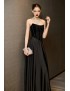 This black evening gown blends classic glamour with modern structure. The fitted, corset-inspired bodice sculpts the upper body and draws the eye to a narrow waist, before transitioning into a long, fluid skirt that glides to the floor. The strapless neckline keeps the look clean and elegant, making it ideal for showcasing a necklace or bare décolletage. Whether you’re walking into a ballroom or attending a formal celebration, this gown creates a statuesque, red-carpet silhouette that feels polished and sophisticated.
